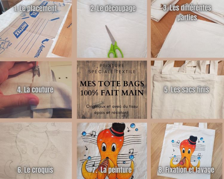 Voici une page consacrée aux différentes étapes de confection de mes tote bags, car oui on ne s’en rend pas forcément compte, mais il y a du chemin avant d’obtenir votre tote bag 100% fait main.