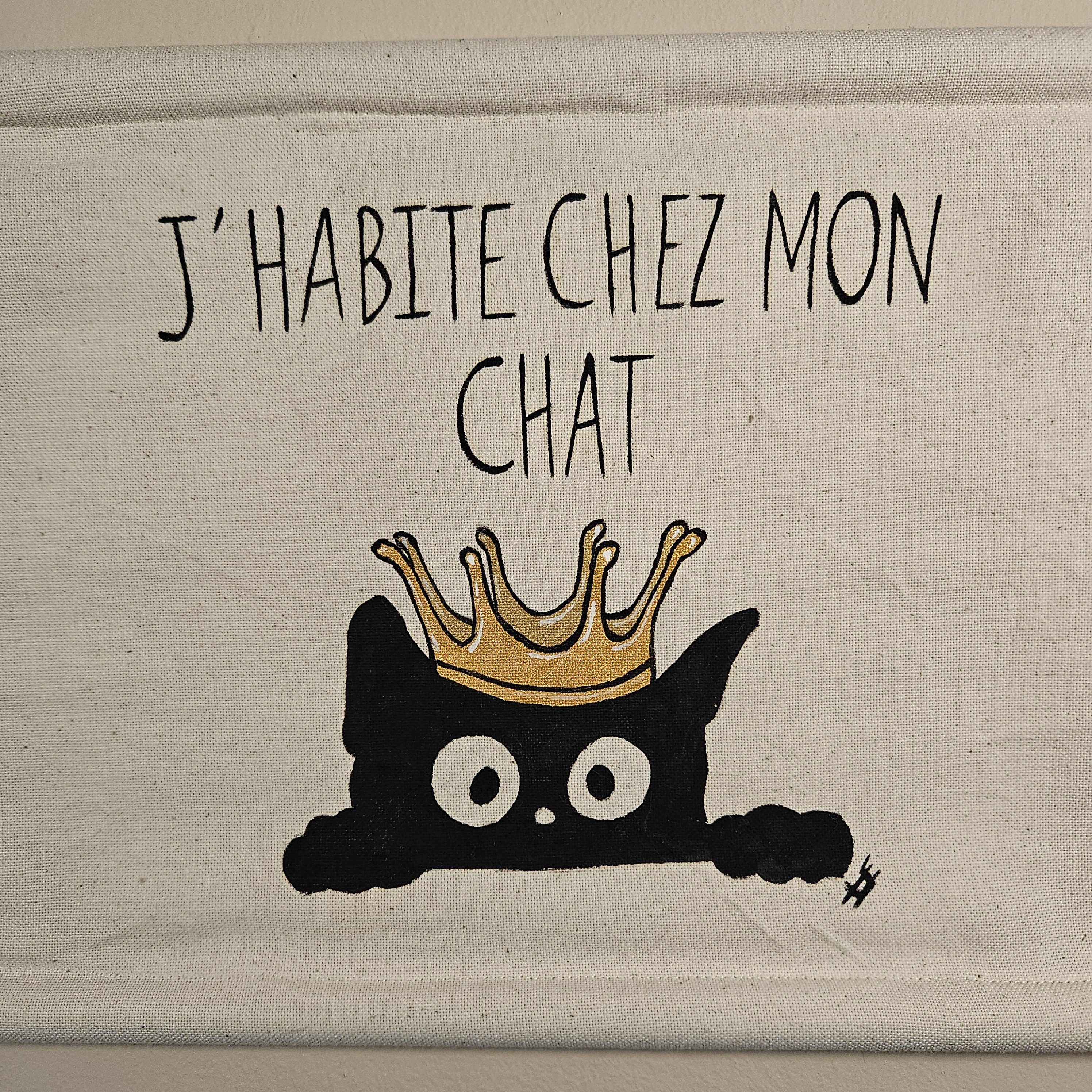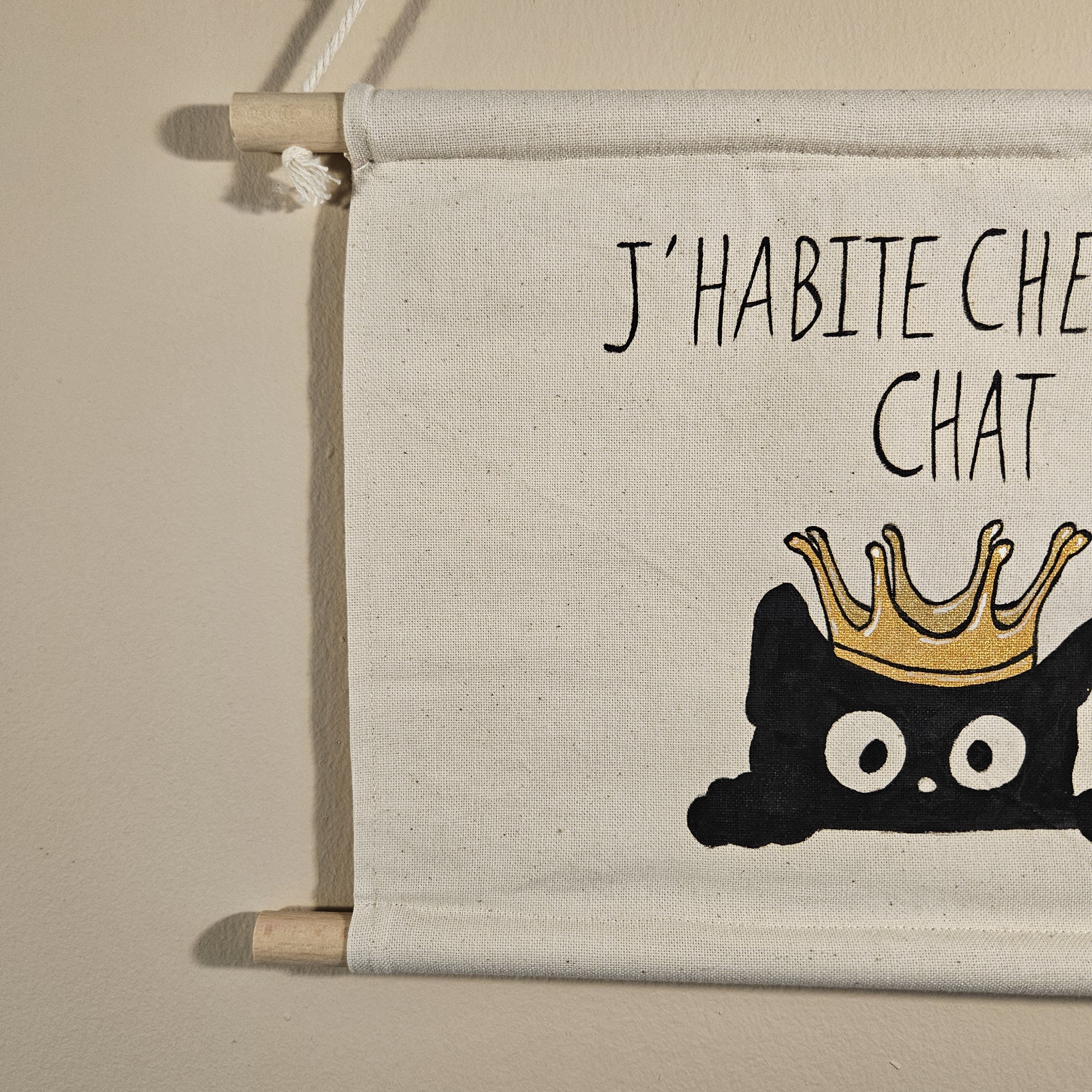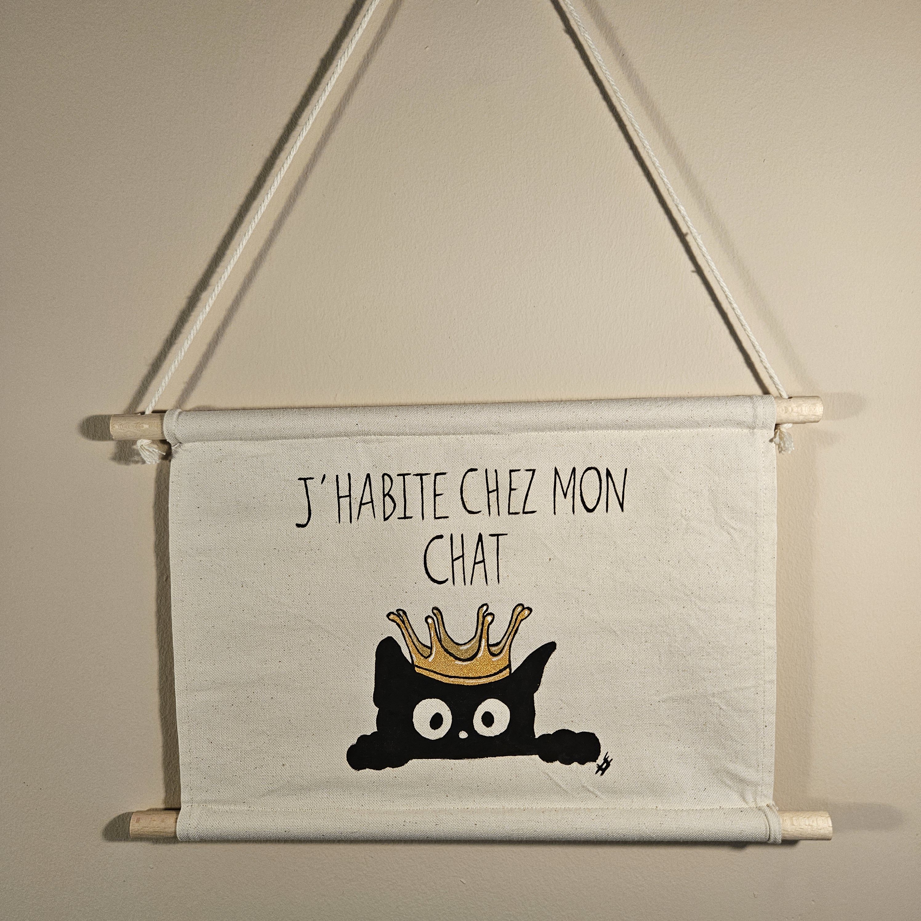 Si tu as cliqué sur cette banderole, c’est qu’on sait tous les deux pourquoi. Tu adores ton chat, il a le droit à de la pâté 3 fois par jour, des gratouilles dès qu’il te regarde plein d’amour et j’en passe ! Alors pourquoi pas opter pour une jolie banderole en l’honneur de nos amis à poils ? En voilà une décoration originale pour ta maison ou pour offrir ! Je te présente la banderole « J’habite chez mon chat ».