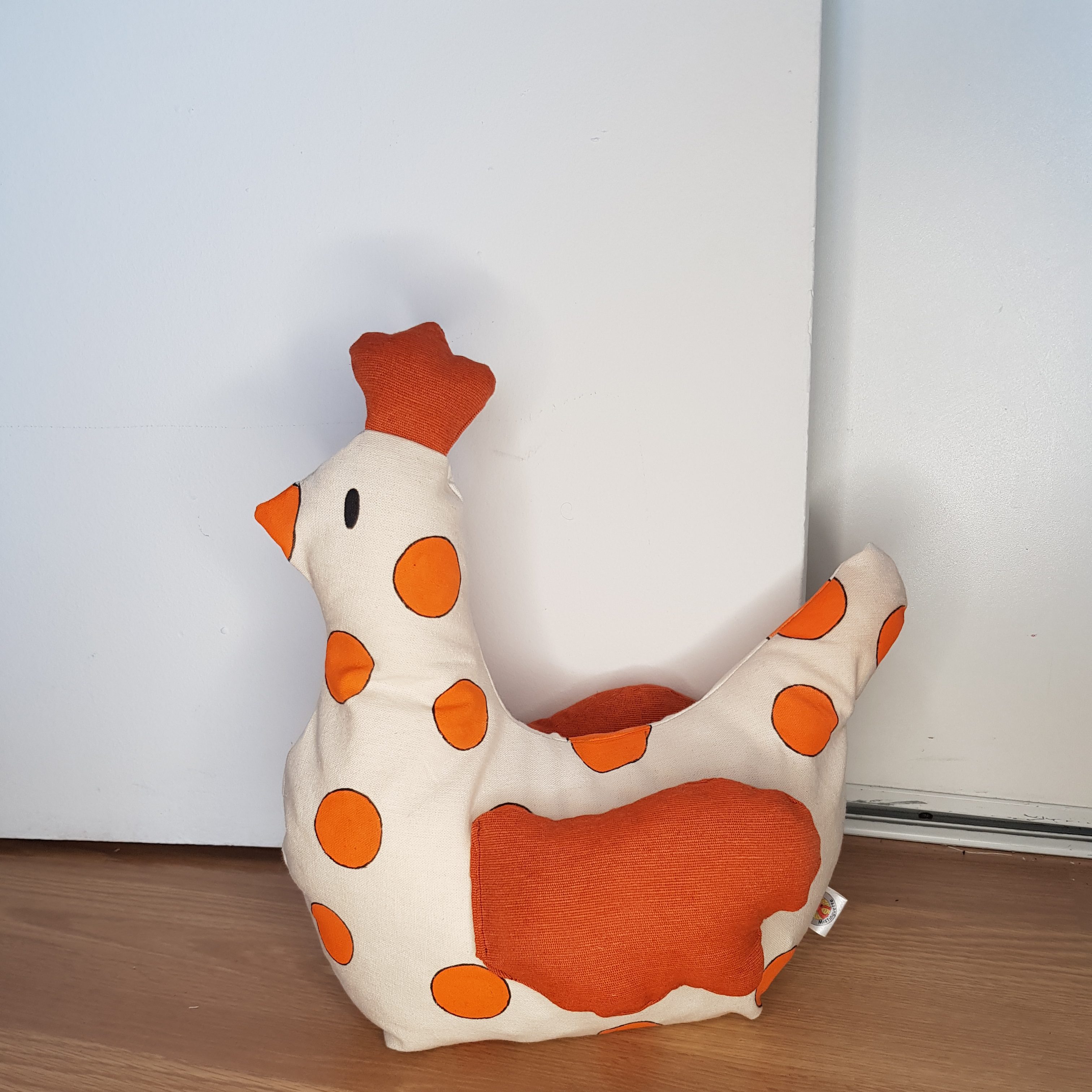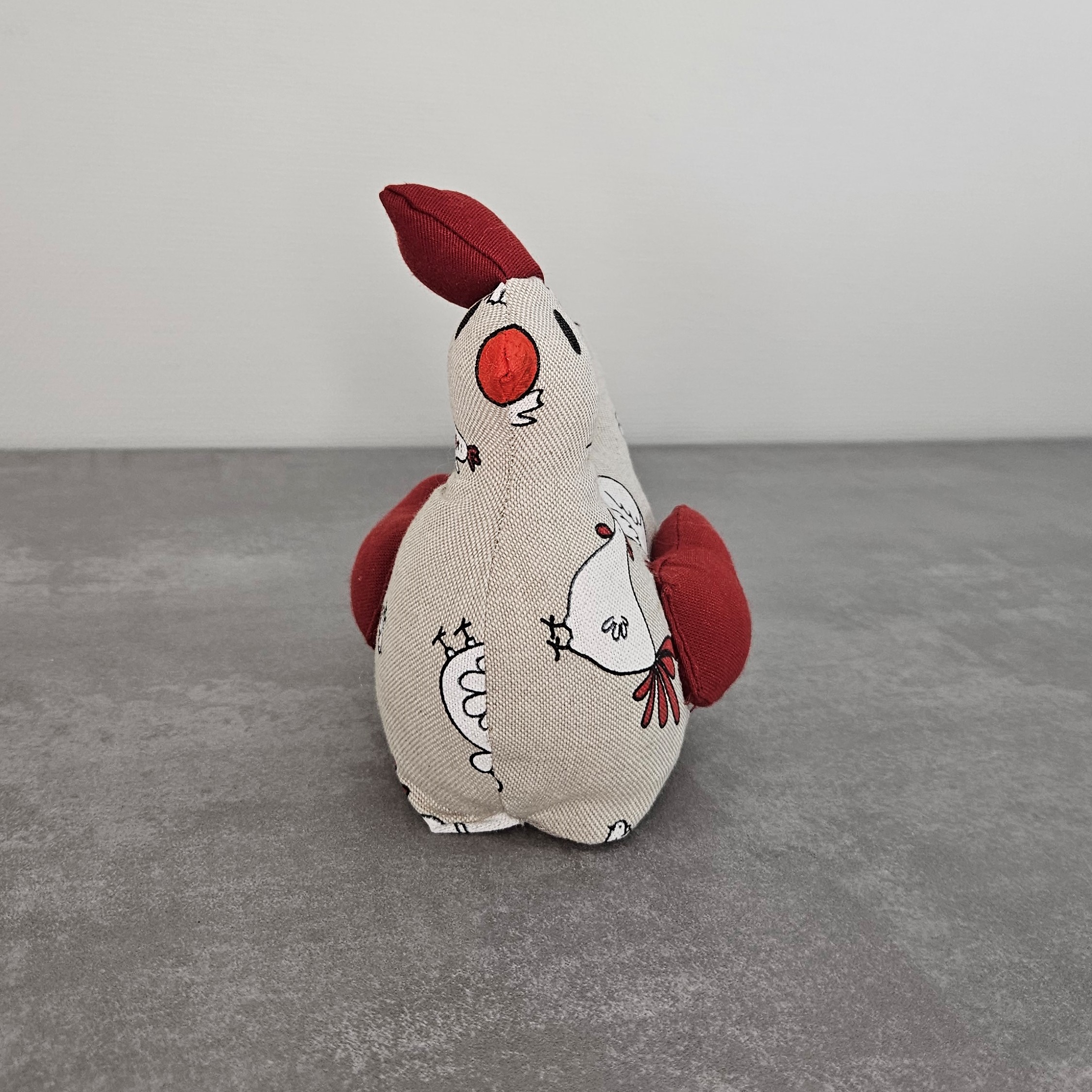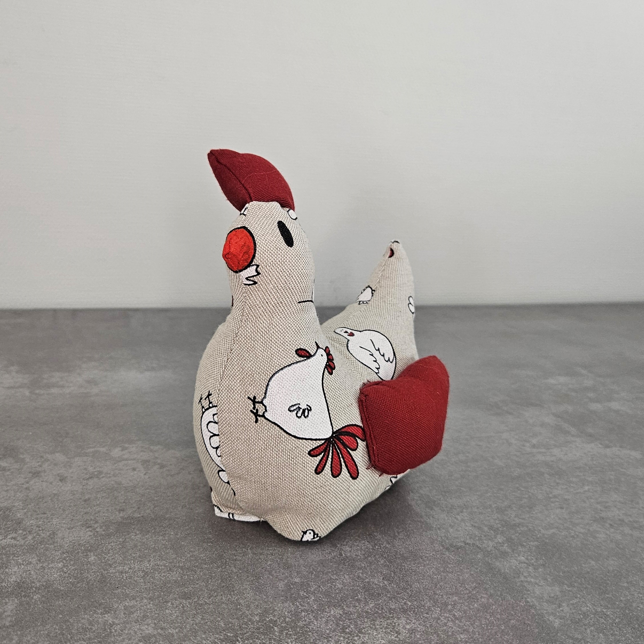 Ce cale porte est cousu dans mon atelier. Pour cette poule, j’utilise du tissu en coton imprimé poules pour le corps de la poule et du tissu en coton uni de couleur rouge pour les ailes et la crête. Je peins ensuite à la main les yeux et le bec de la poule (peinture textile).