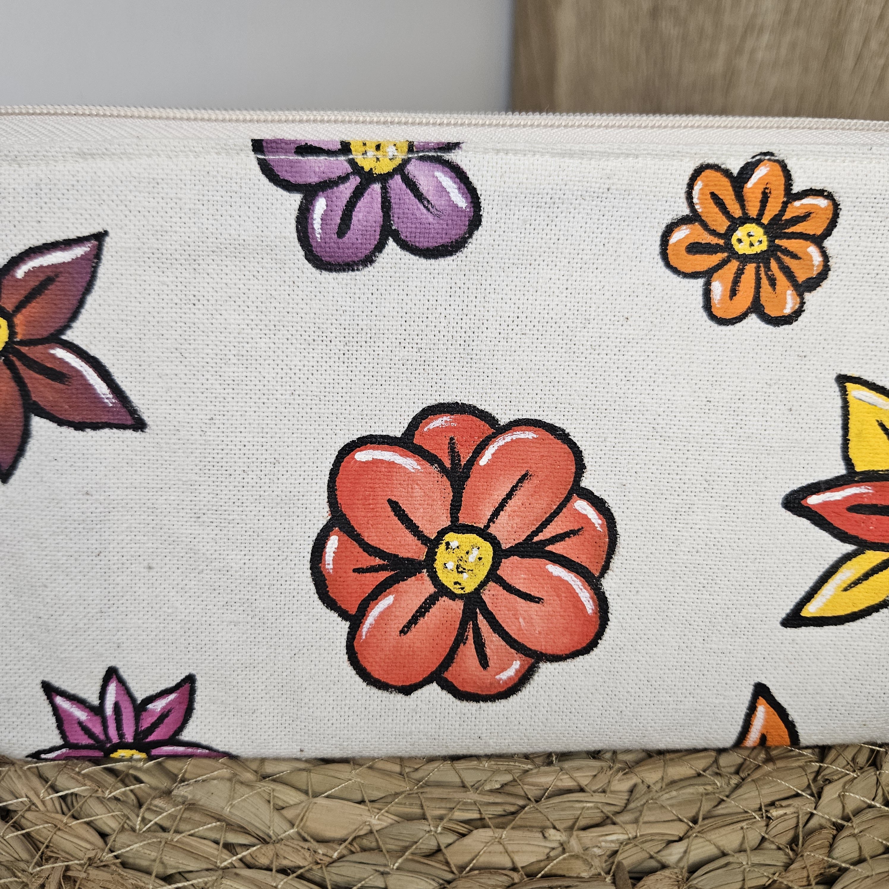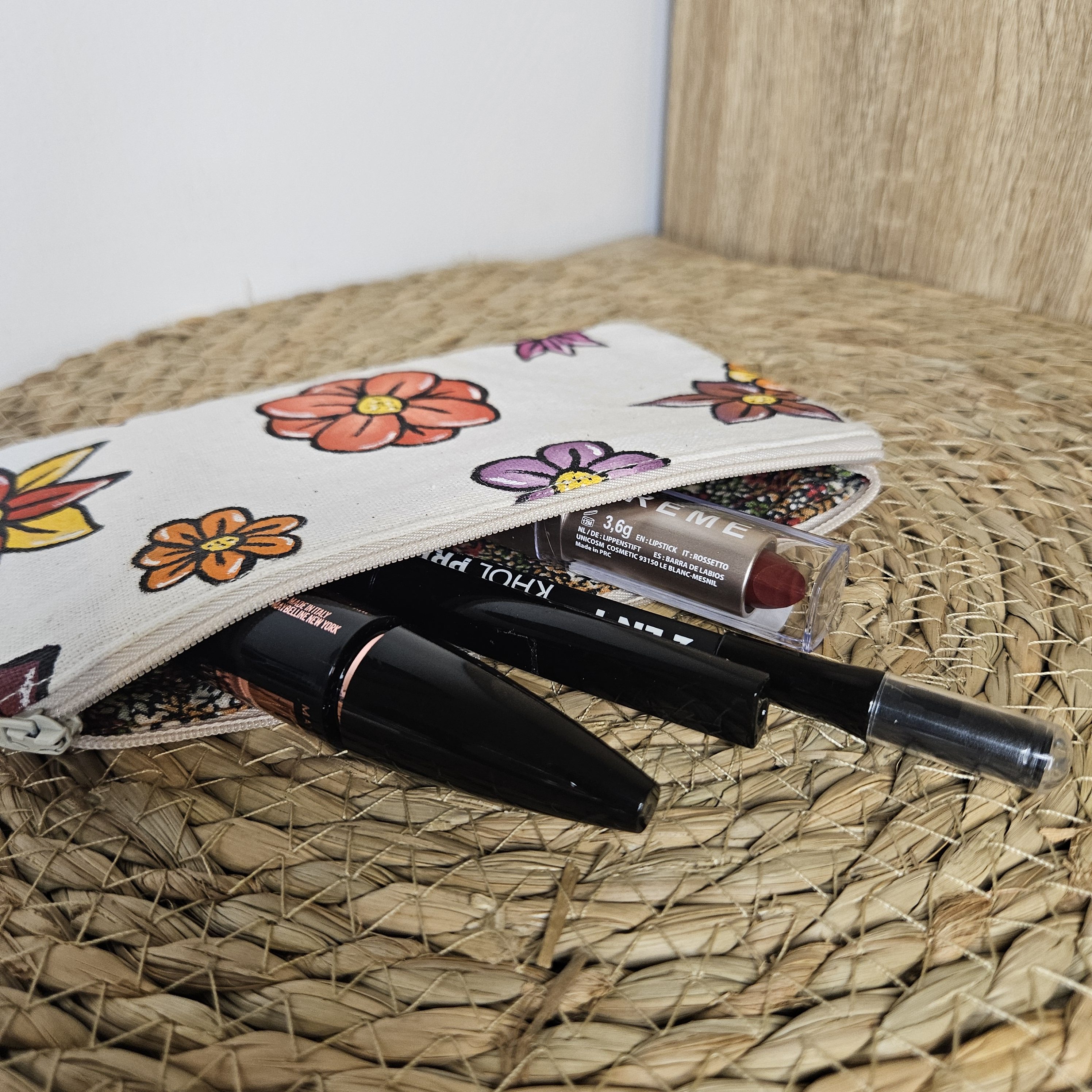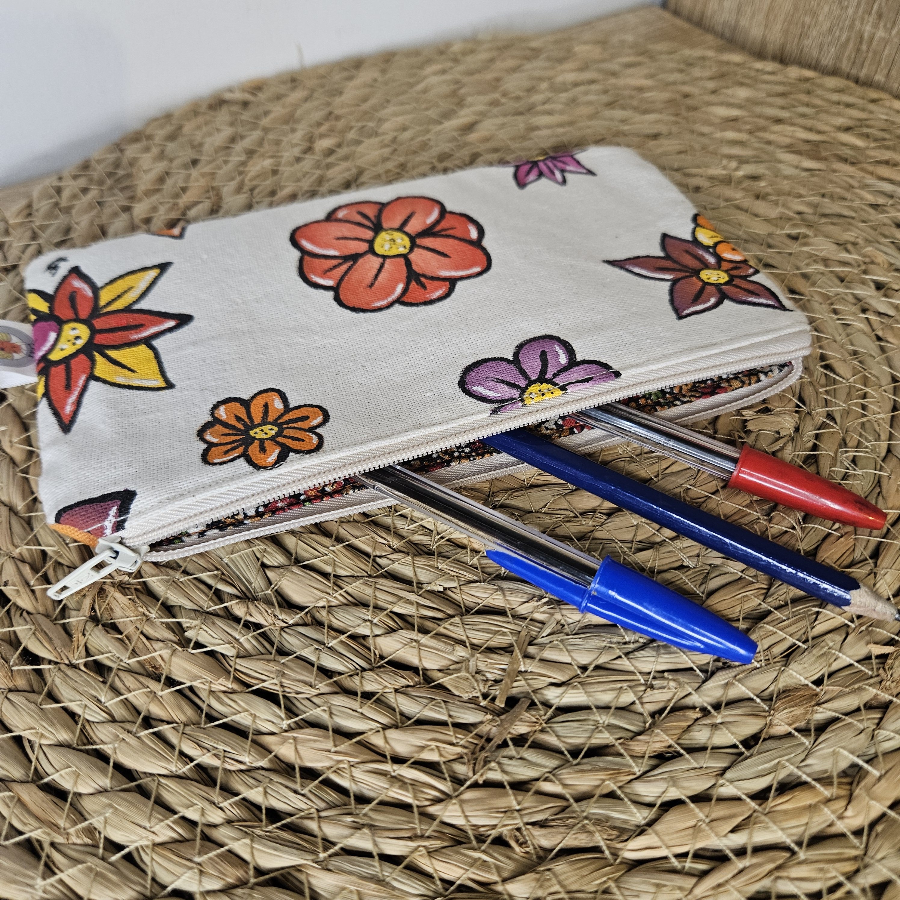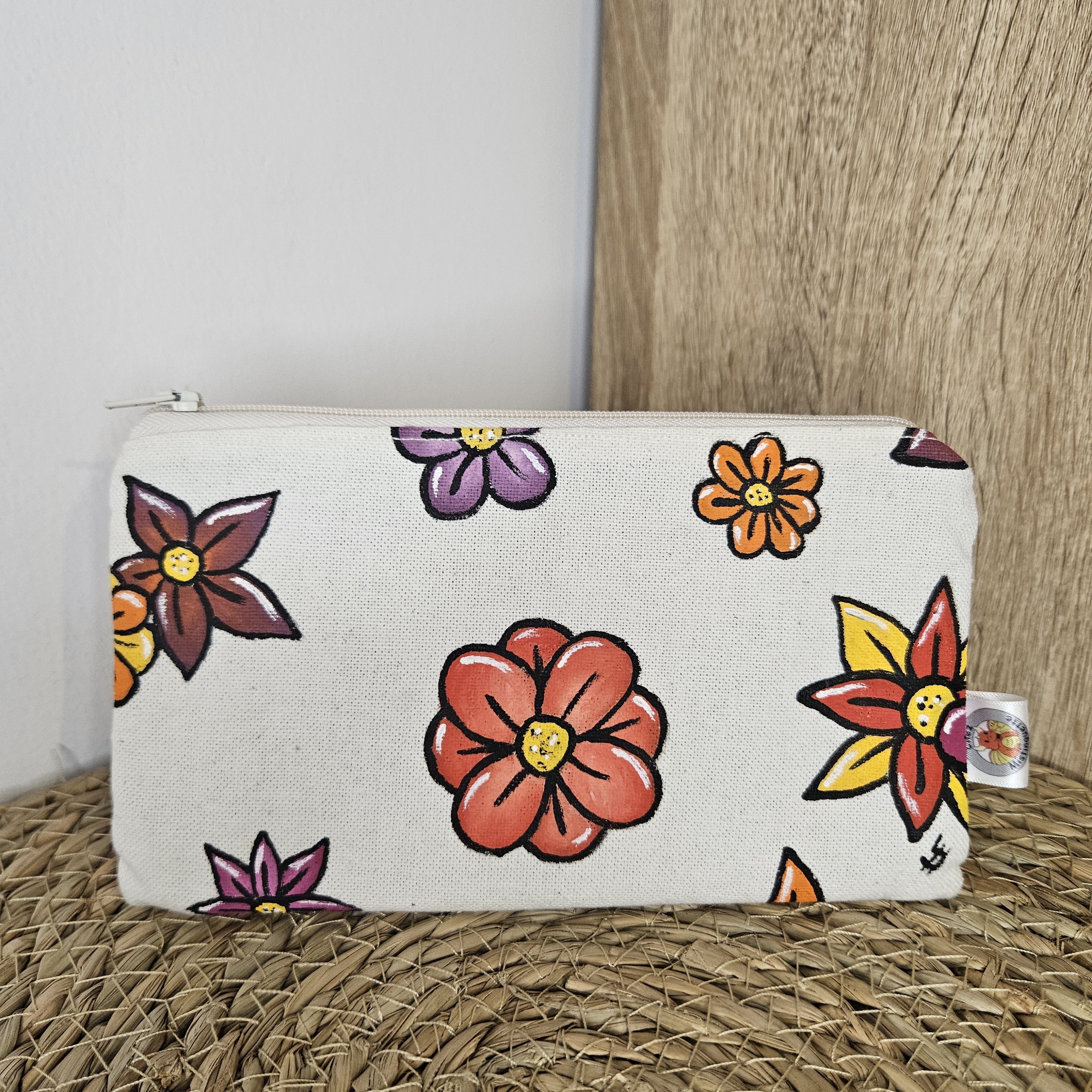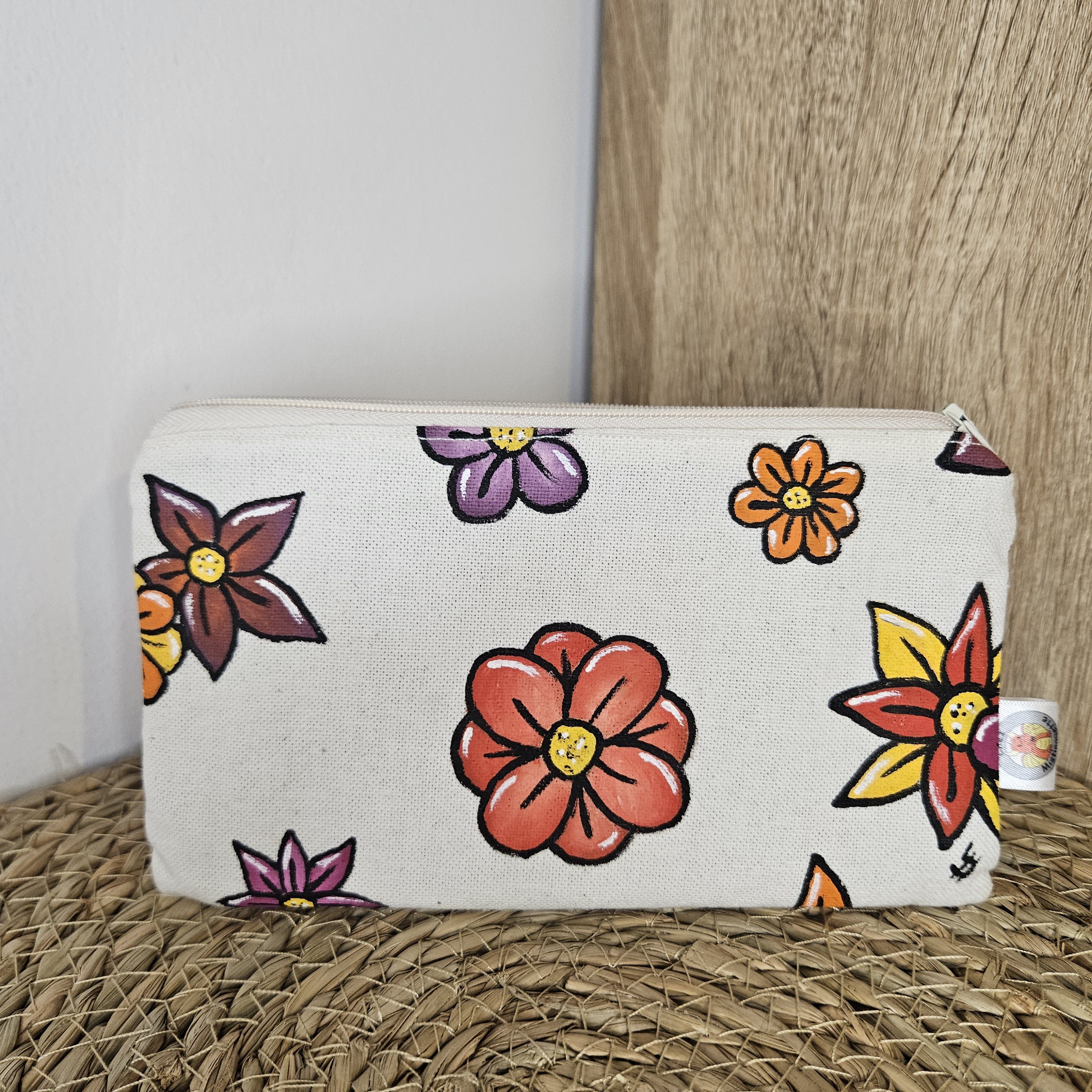 Son originalité ? J’imagine chacun de mes dessins dans mon atelier, tu ne les retrouveras nul part ailleurs. La pochette fleurs est entièrement peinte à la main avec minutie et patience. Ce dessin est l’un des plus long de ma gamme. Chaque coup de pinceau est différent ce qui rend chaque création unique ! Je peins oui mais pas avec n’importe quelle peinture. J’utilise de la peinture exprès pour textile. Chacune de mes créations est lavable en machine à 30°C. De plus je choisis mes tissus avec minutie pour trouver le match idéal entre doublure, arrière de couleur et dessin pour enfin coudre chacune de mes créations dans mon atelier ! Le choix de l’arrière est vital pour rajouter la touche de couleur qui va faire ressortir le dessin.