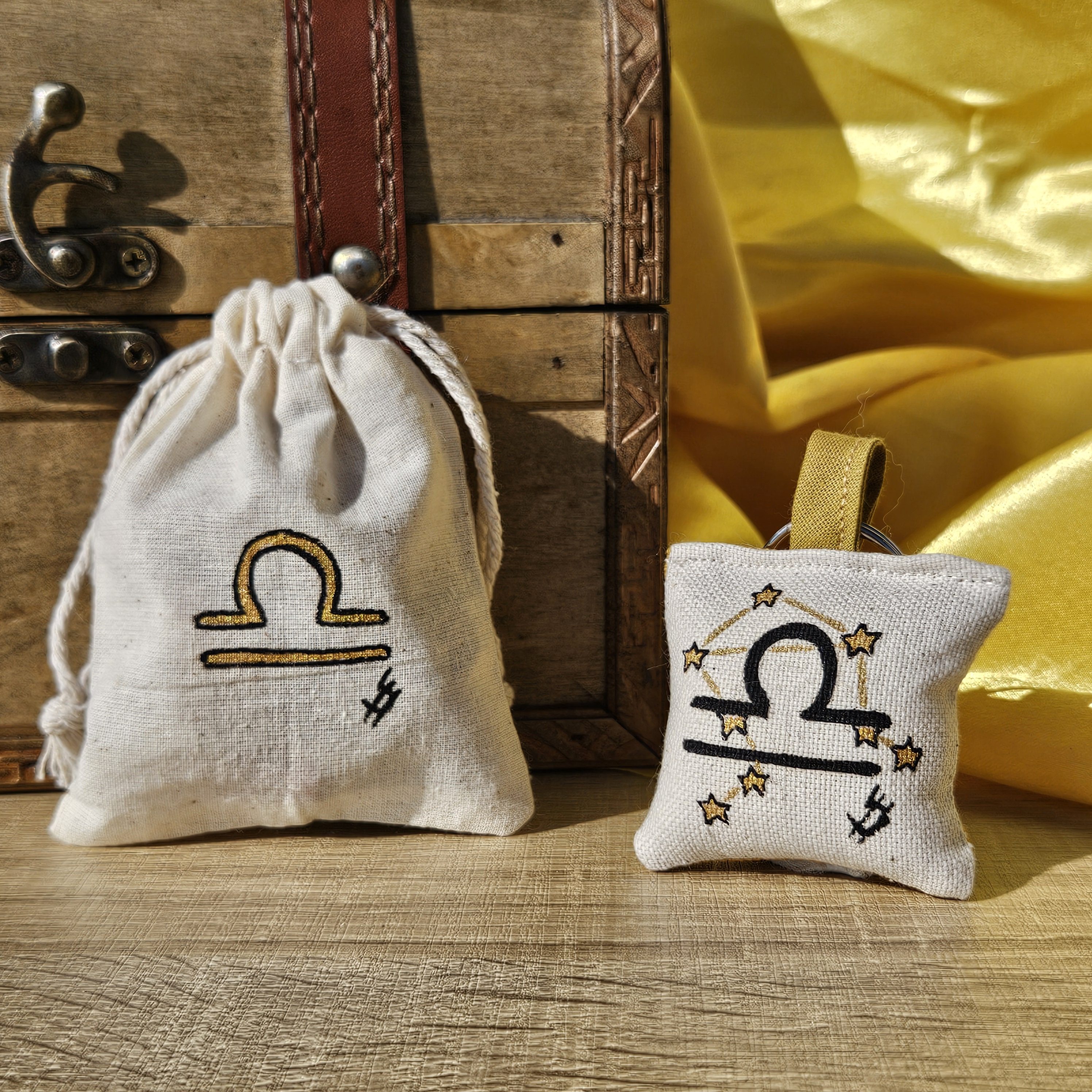 Après la peinture place à la couture, la collection tourne autour des couleurs dorées/jaune pour rappeler le côté mystique et astral des signes astrologiques. Le dessin est peint sur du tissu toile de coton écru et l’arrière est moutarde. Tu peux le laver sans problème en machine en enlevant l’anneau en métal. De plus, chaque porte-clé Balance est confectionné de A à Z dans mon atelier dans le sud de la France.
