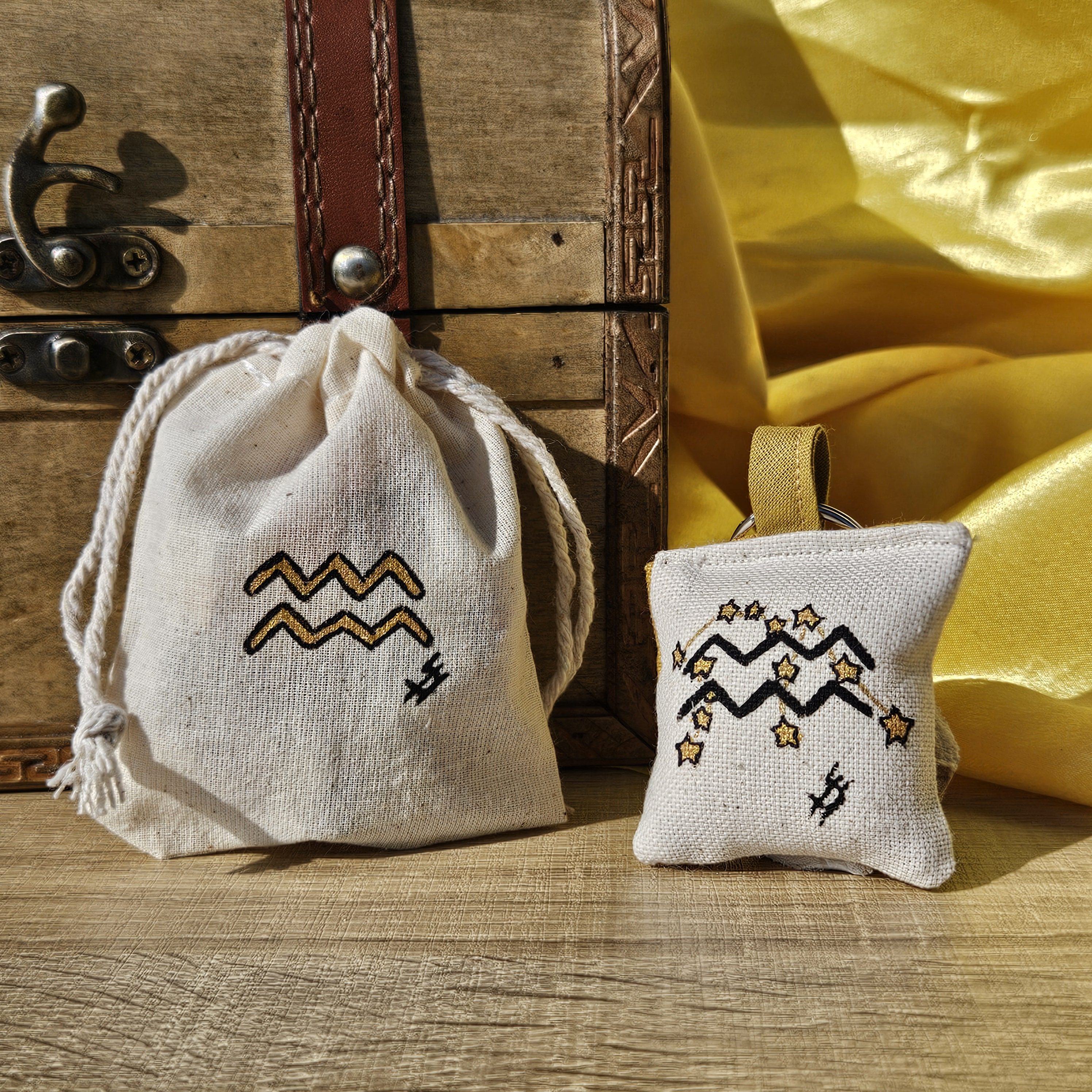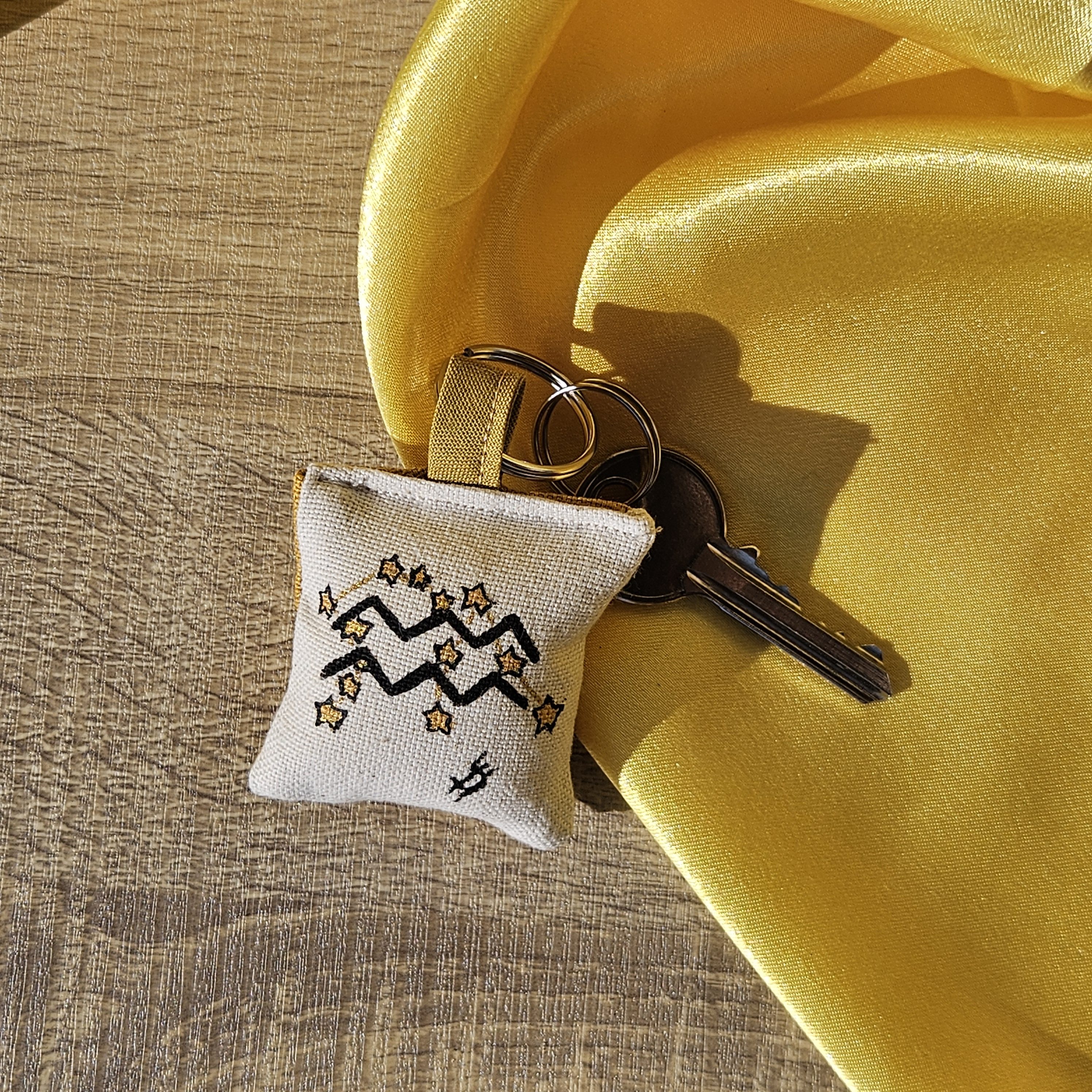 Après la peinture place à la couture, la collection tourne autour des couleurs dorées/jaune pour rappeler le côté mystique et astral des signes astrologiques. Le dessin est peint sur du tissu toile de coton écru et l’arrière est moutarde. Tu peux le laver sans problème en machine en enlevant l’anneau en métal. De plus, chaque porte-clé Verseau est confectionné de A à Z dans mon atelier dans le sud de la France.
