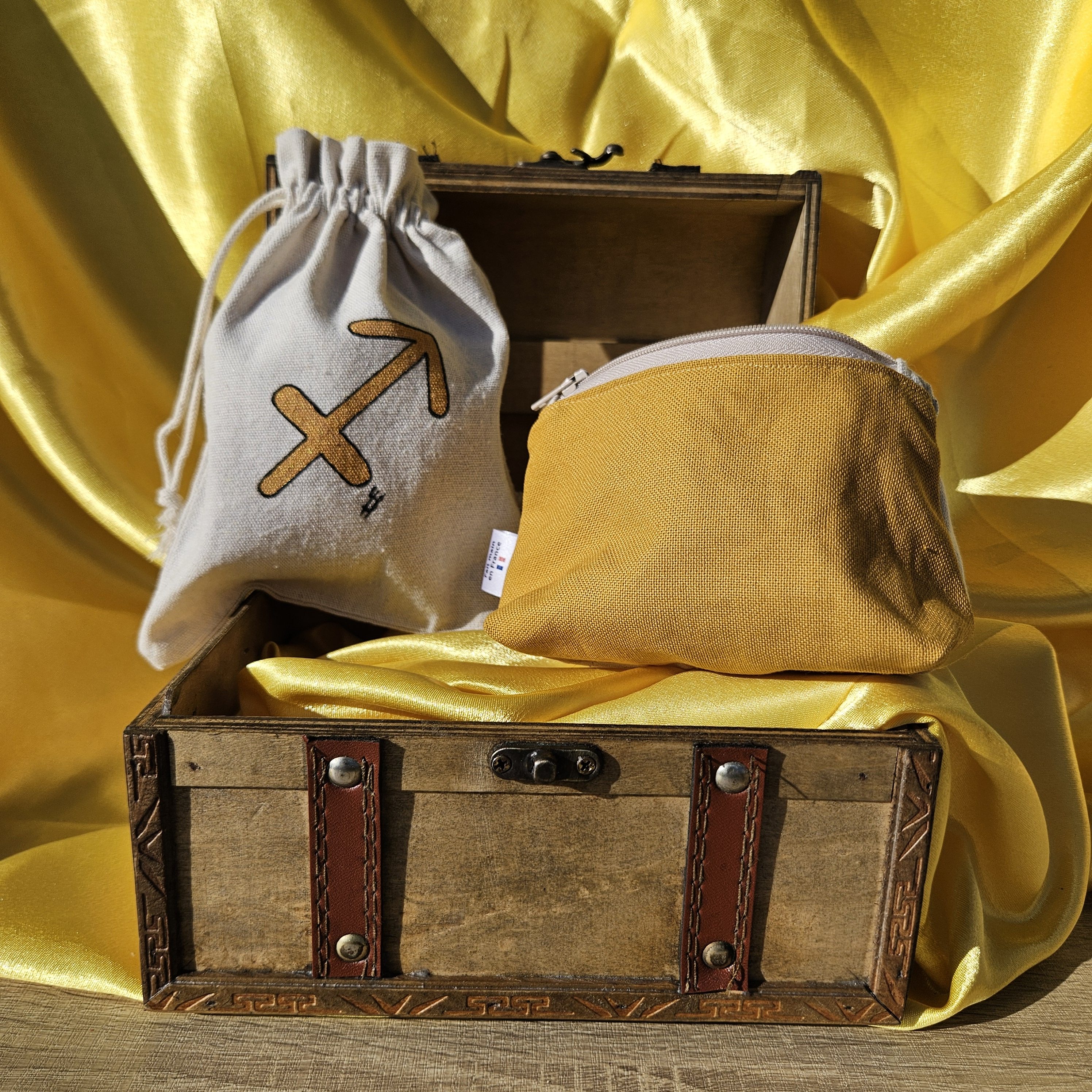 Après la peinture place à la couture, la collection tourne autour des couleurs dorées/jaune pour rappeler le côté mystique et astral des signes astrologiques. Pour le Sagittaire, signe du feu, la doublure étoilée vient compléter l’arrière moutarde. De plus, chaque porte-monnaie Sagittaire est confectionné de A à Z dans mon atelier dans le sud de la France.