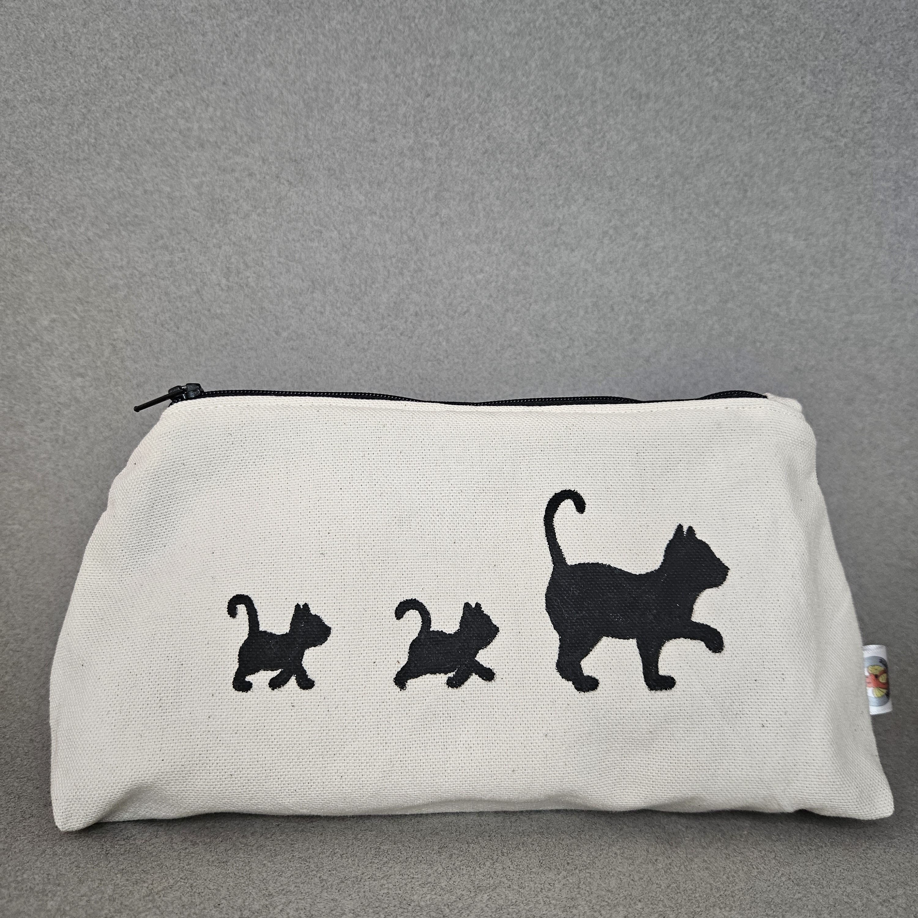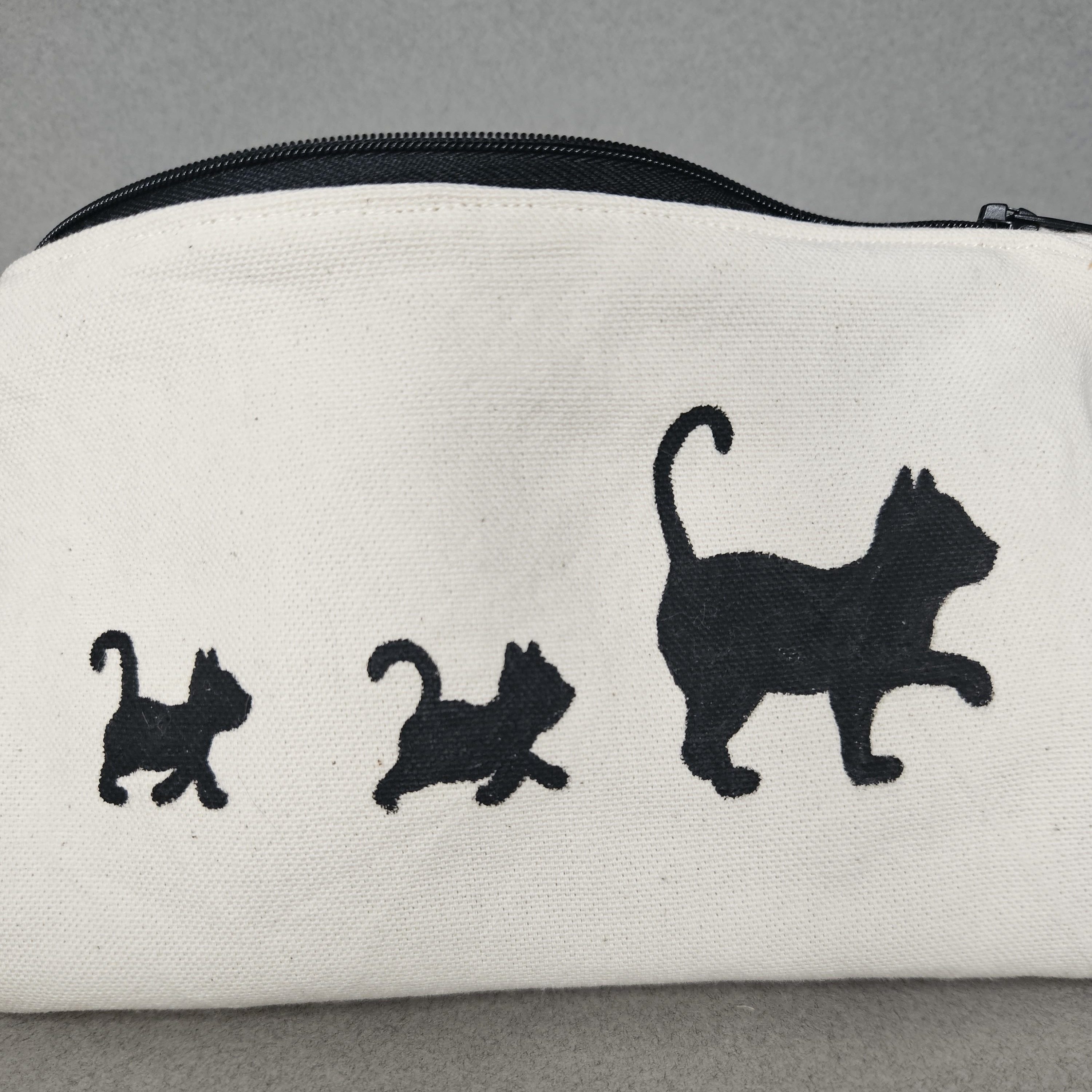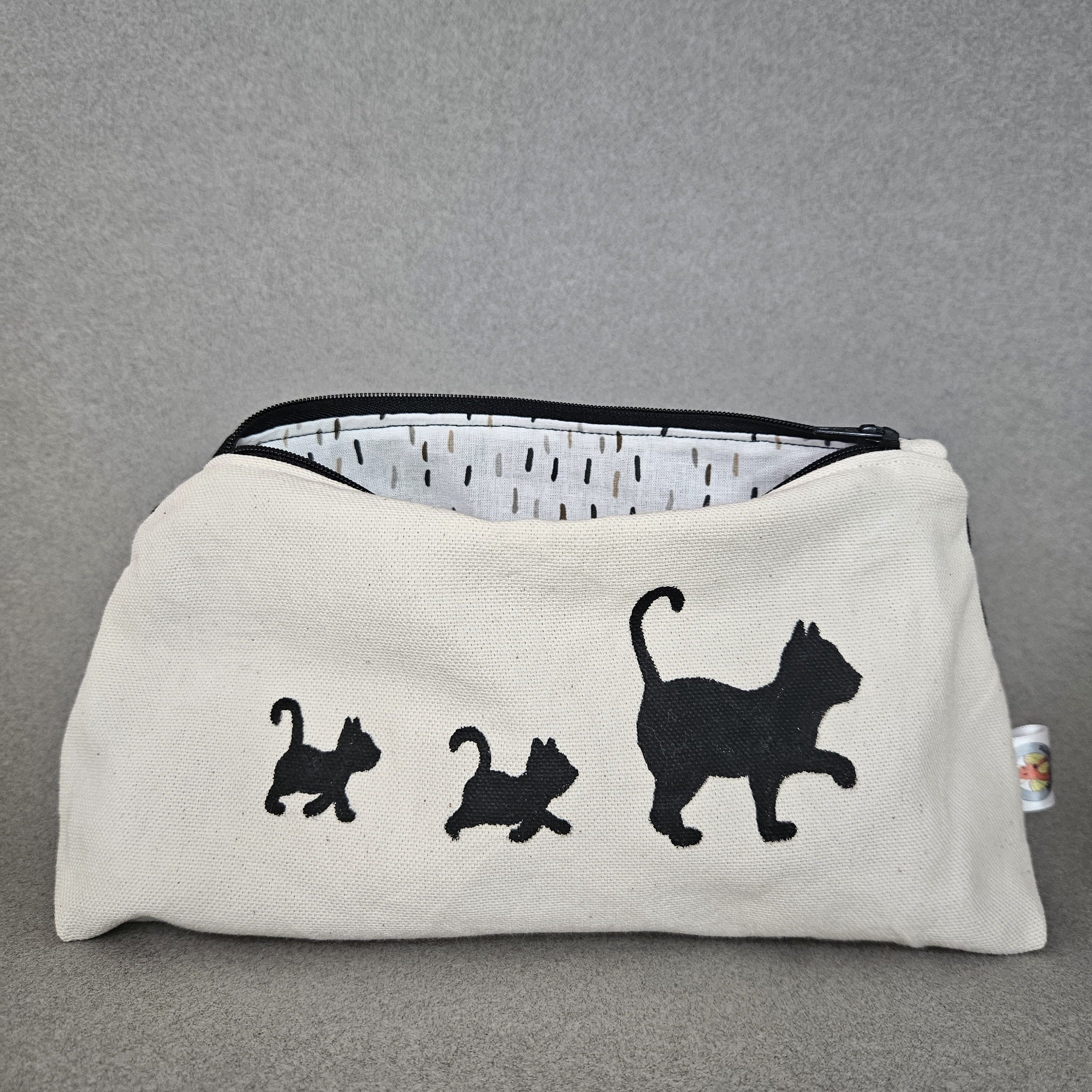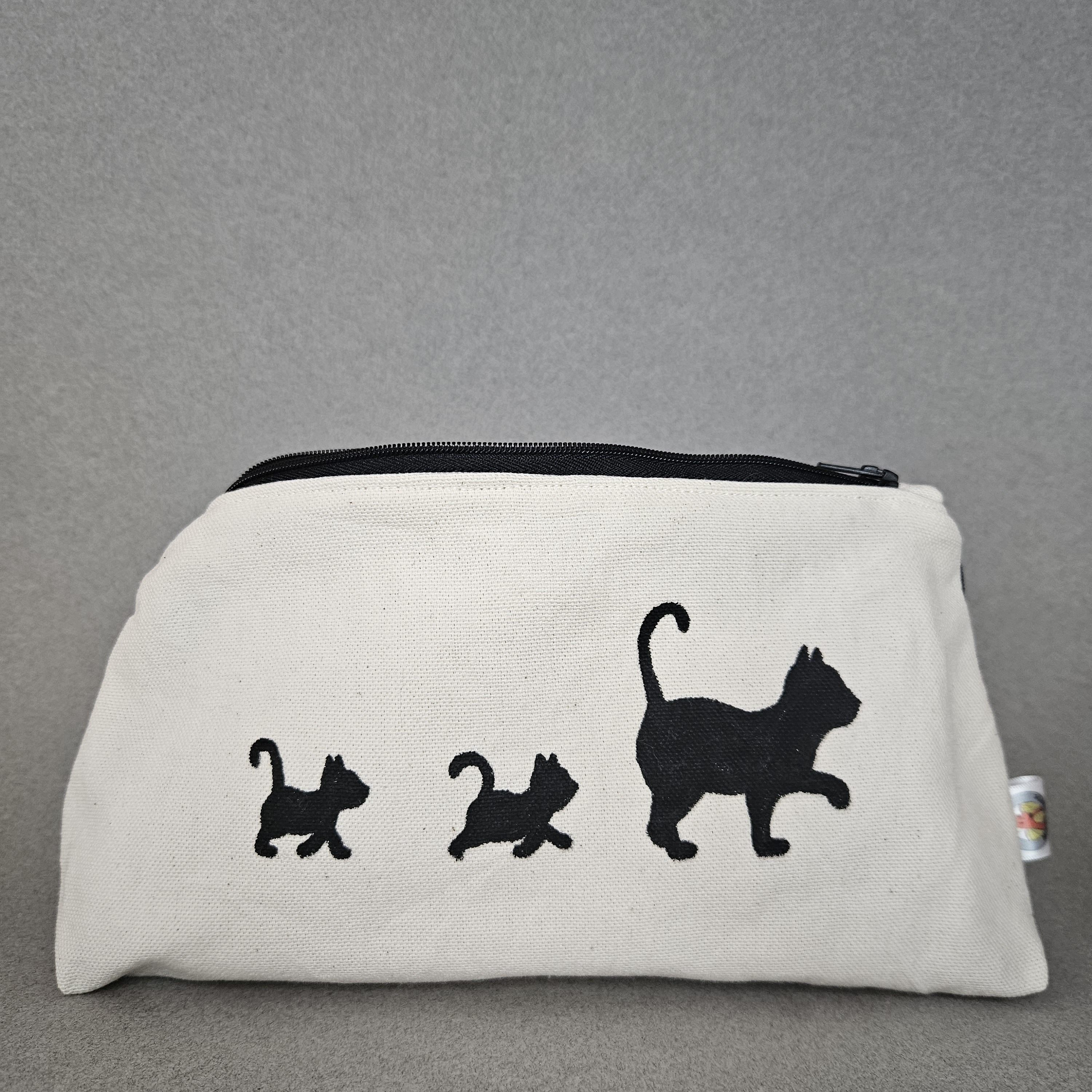 Besoin d’une trousse originale pour la rentrée ? Pour ranger tes affaires personnelles ou voyager ? J’ai ce qu’il te faut pour t’accompagner partout où tu vas ! Ce trio de drôles de chats te parlera sûrement ! Cette trousse est cousue puis peinte à la main avec de la peinture exprès pour textile, lavable en machine à 30°C. Elle est composée d’une fermeture éclair noire et d’une doublure blanche avec des petits traits noirs, gris et crèmes.