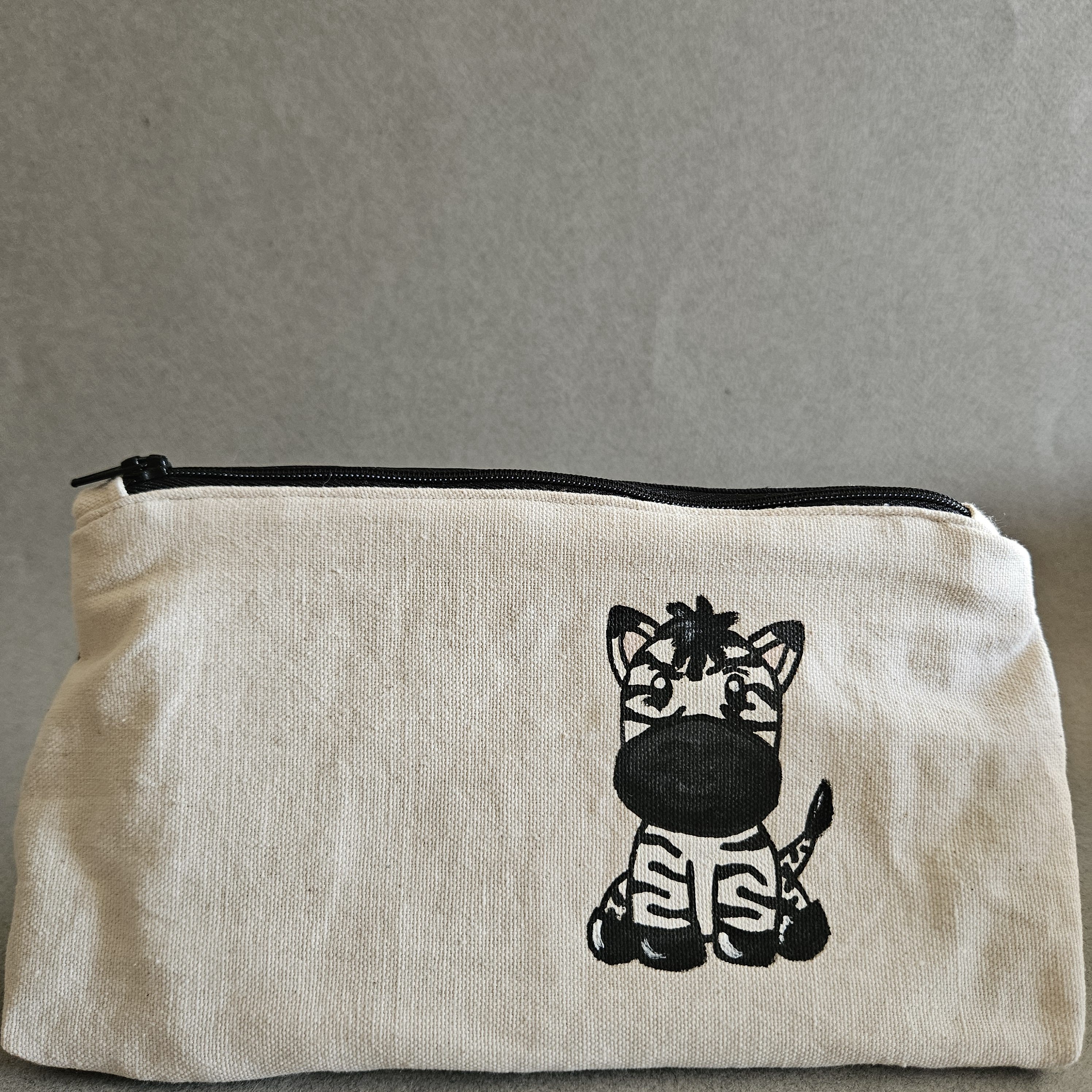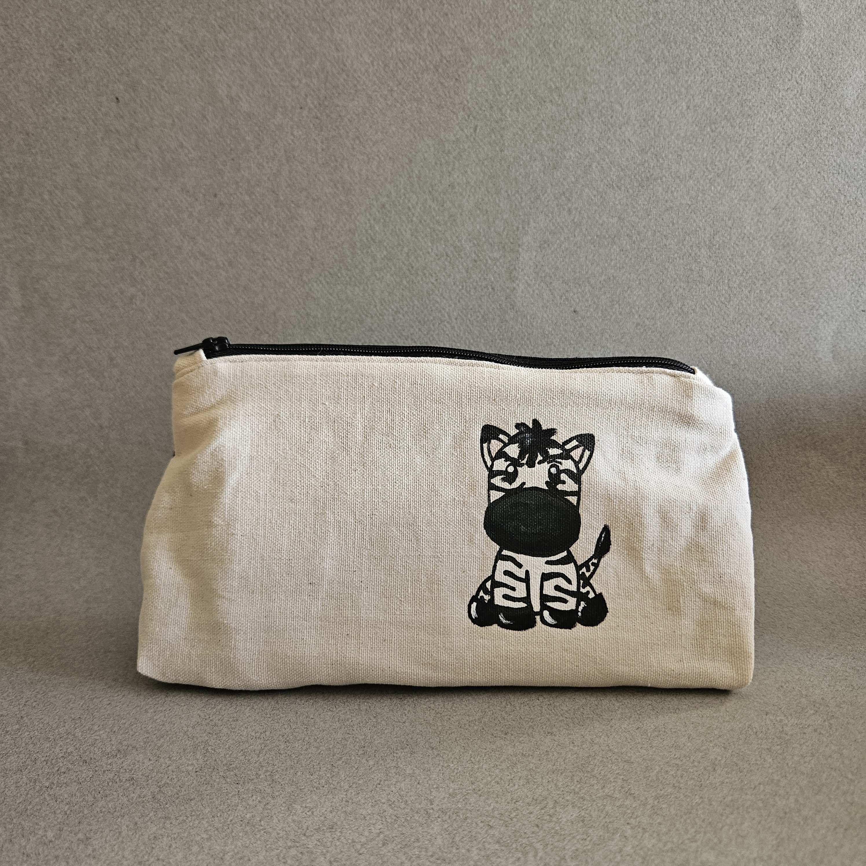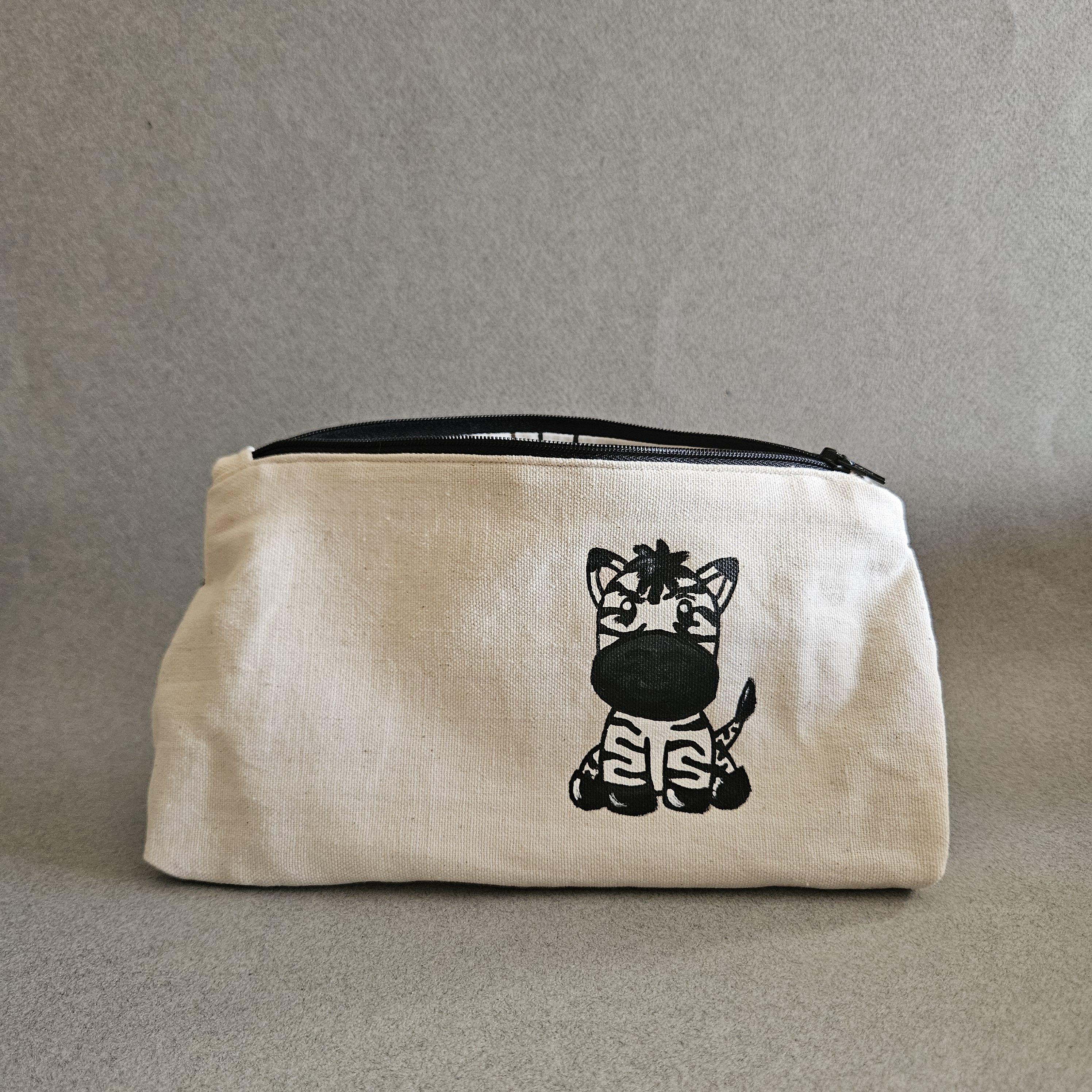 Son originalité ? Elle est entièrement peinte à la main avec de la peinture exprès pour textile puis cousue dans mon atelier. Voici la trousse zèbre, originale, unique, et lavable en machine à 30°C.